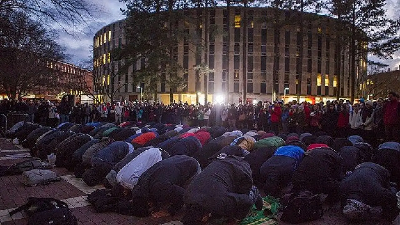 Kuzey Carolina Devlet Üniversitesi’nde yapılan tören öncesinde de kasabadaki Müslümanlar, etkinlik alanında toplu akşam namazı kıldı.