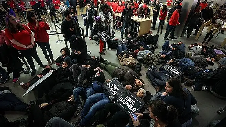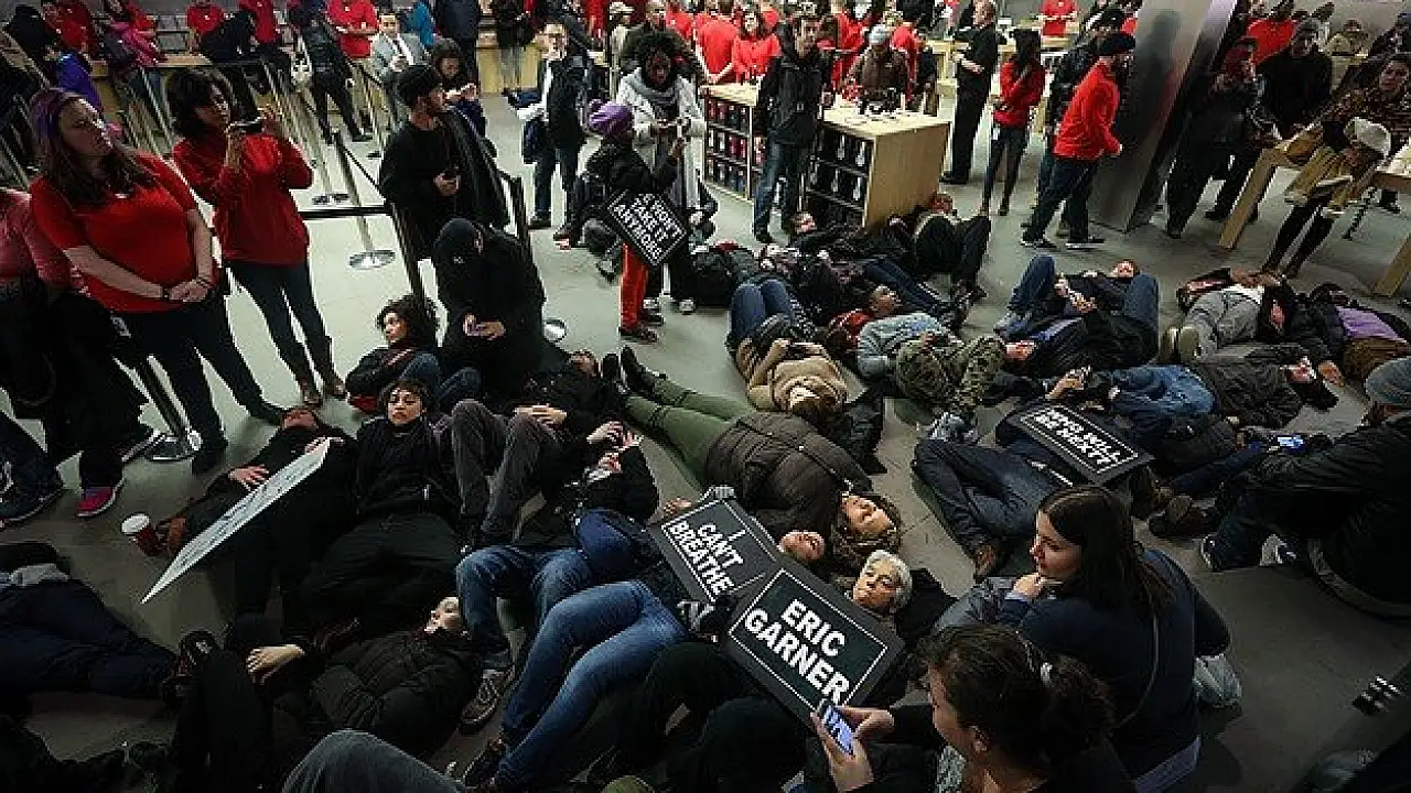 Güvenlikçilerin müdahale etmediği göstericiler, müşterilerin şaşkın bakışları arasında mağazanın ortasında siyahların polis tarafından öldürülmesini temsilen, yere yatarak bir süre sessizce durdular. Herhangi bir müdahaleyle karşılaşmayan göstericiler 5 dakikalık eylemin ardından mağazadan çıkarak 5. Cadde'den Times Meydanı yönüne "Nefes alamıyorum", "Adalet yoksa barış da yok", "Siyahilerin hayatları da değerli" sloganlarıyla bir süre yürüdüler.