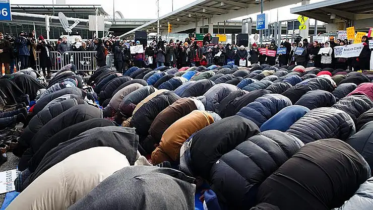 New York'taki Müslüman Amerikalılar, ABD Başkanı Donald Trump'ın göçmen karşıtı başkanlık kararnamelerine karşı dayanışma gösterisinde bulunmak amacıyla JFK Uluslararası Havalimanı'nda topluca cuma namazı kıldı.