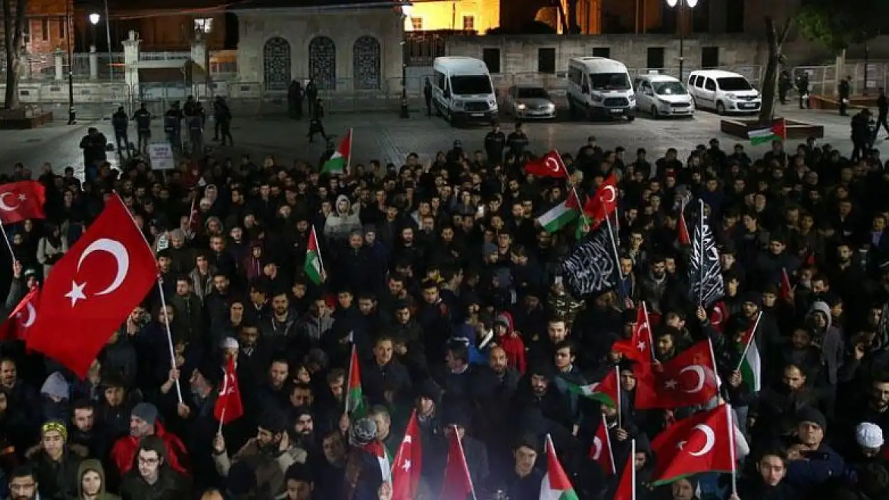 Türkiye ve Filistin bayrakları taşıyan grup, "Kudüs Müslümanlarındır" yazılı döviz taşıyıp çeşitli sloganlar attı.
