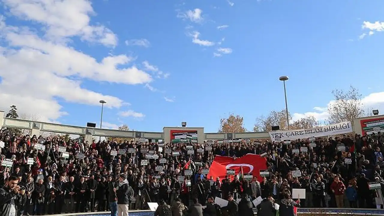 Kentte öğrenim gören 60 farklı ülkeden onlarca öğrencinin de destek verdiği protesto gösterisinde, Türkçe, İngilizce, Arapça, Fransızca ve Rusça "Kudüs ümmetindir" açıklaması okundu.