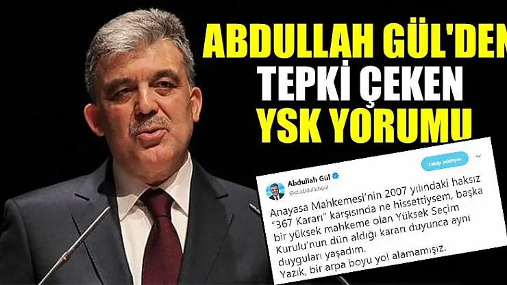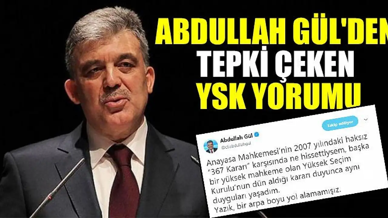 Abdullah Gül açıklamasında, "Anayasa Mahkemesinin 2007 yılındaki haksız 367 kararı karşısında ne hissettiysem, başka bir yüksek mahkeme olan Yüksek Seçim Kurulu'nun dün aldığı kararı duyunca aynı duyguları yaşadım" dedi. Gül mesajını "yazık, bir arpa boyu yol alamamışız" ifadelini kullandı.