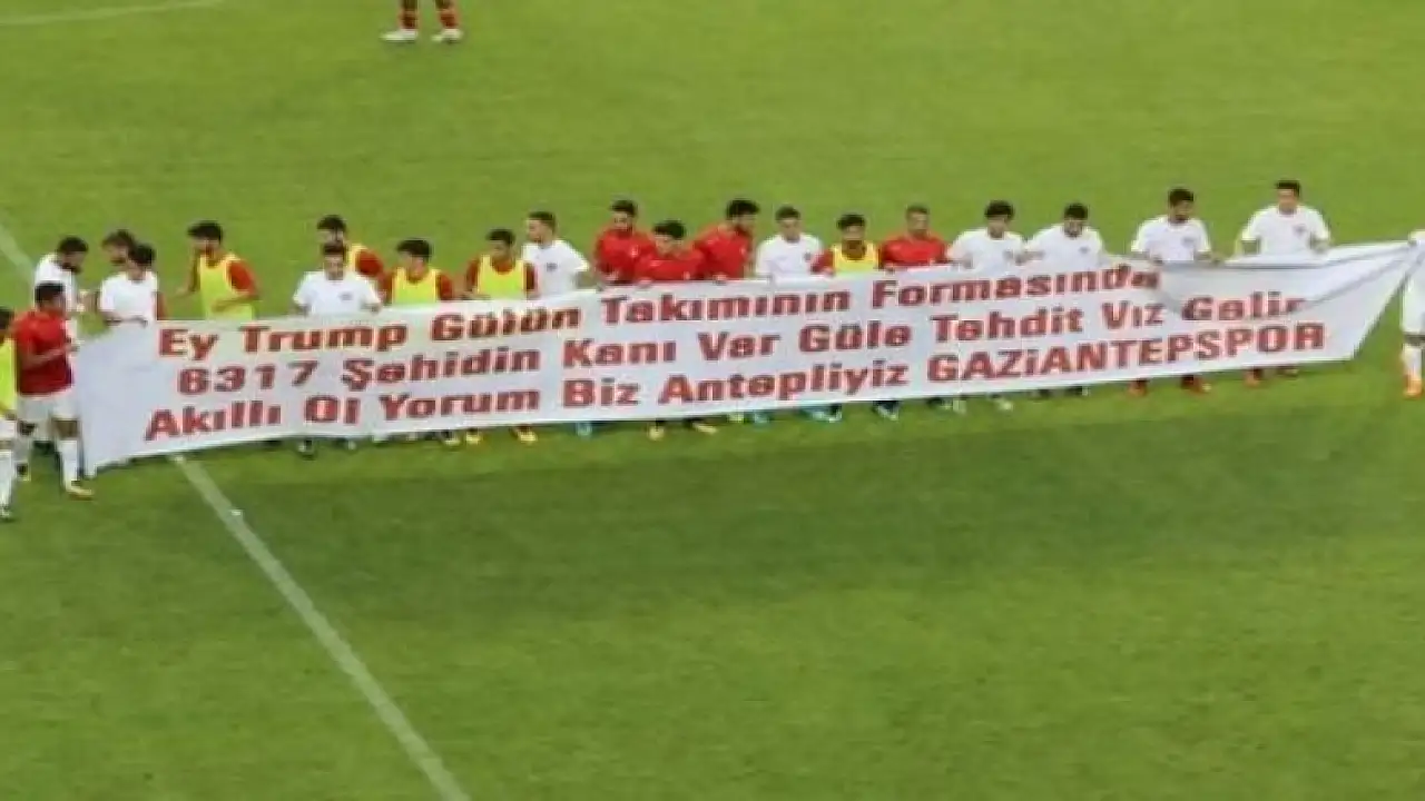 Gaziantepsporlu futbolcuların açtığı pankarta, "Ey Trump, Gül’ün formasında 6 bin 317 şehidin kanı var. Gül’e tehdit vız gelir akıllı ol yorum biz Antepliyiz" yazarak Bakan Gaziantepli Abdulhamit Gül’e destek verdi.