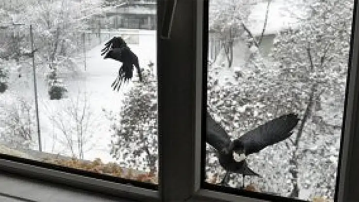 Cam kenarına bırakılan pilav ve ekmek kırıntıları için gelen kargaların ise adeta birbiriyle yarışması gözlerden kaçmadı.