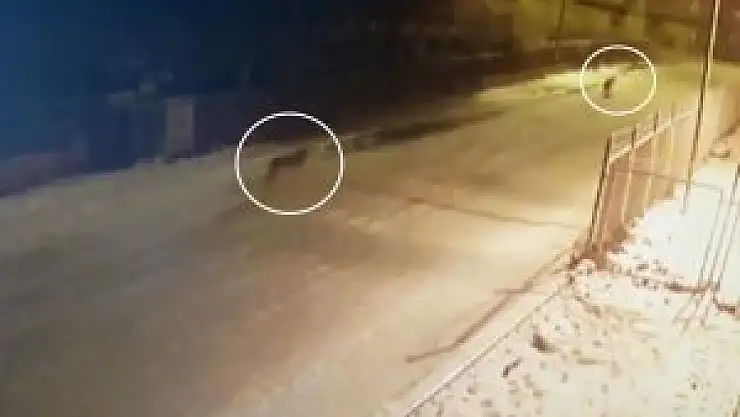 Ardahan'da aç kalan kurtlar, şehir merkezine indi. Güvenlik kameraları yansıyan görüntülerde 2 kurt etrafta yiyecek arıyor.