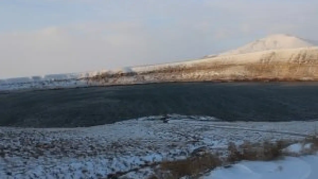 Karapınar’daki volkanik krater gölü olma özelliği taşıyan "Acıgöl" kar yağışı sonrası beyaza bürünürken ortaya kart postallık görüntüler çıktı.