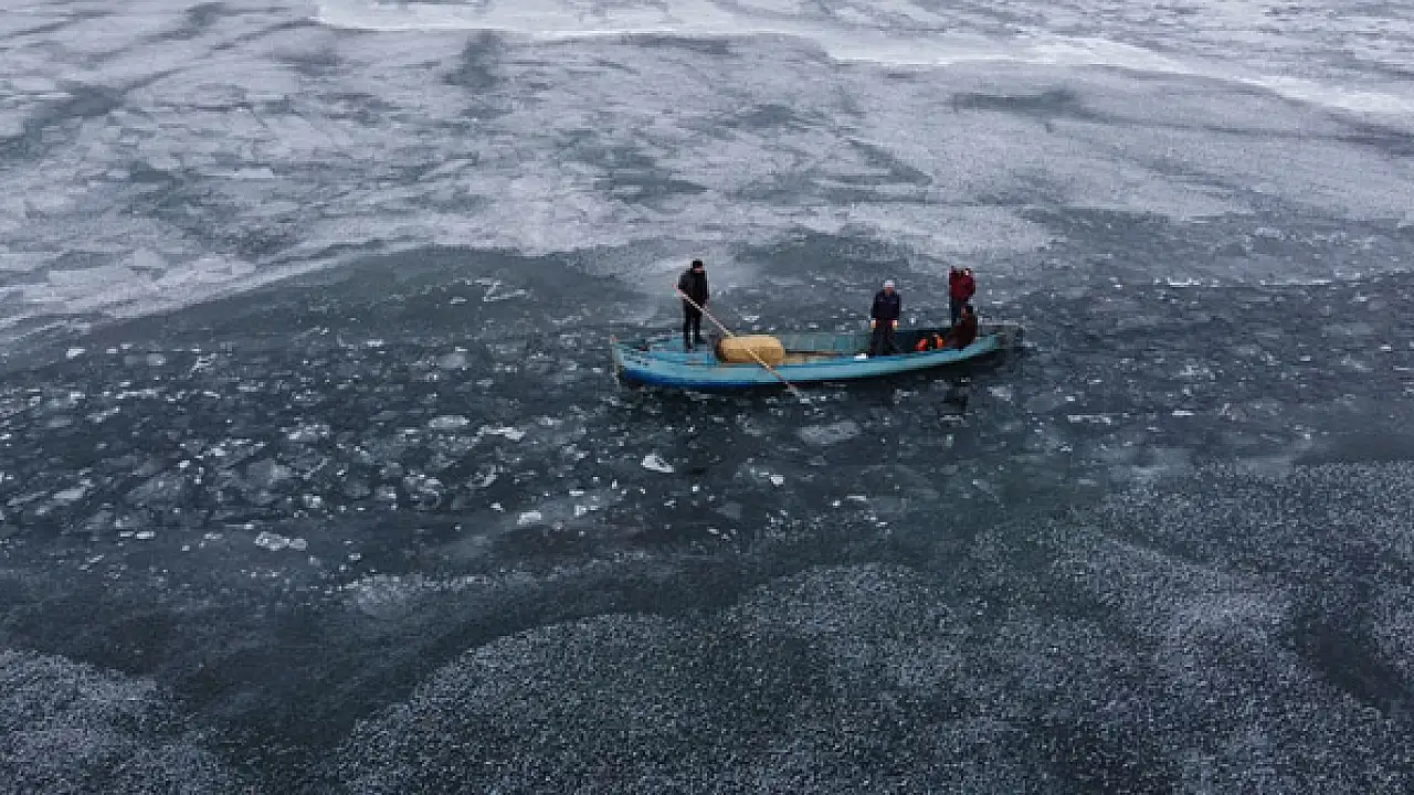 Yerleşim merkezinde balıkçılık da yapan besiciler, limandan tekneye yükledikleri balya samanları, göl üzerinde buzları kırarak süren zorlu bir yolculuğun ardından adaya ulaştırdı.