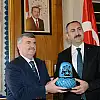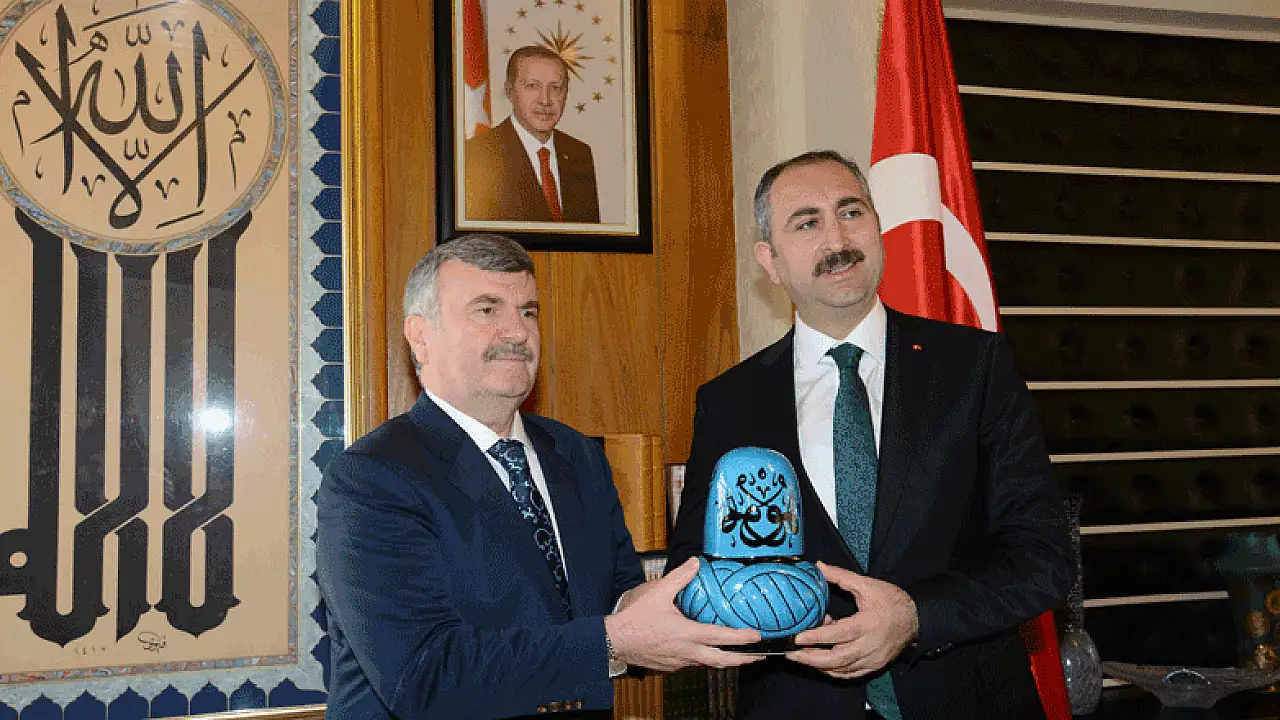 Konya Büyükşehir Belediye Başkanı Tahir Akyürek, Adalet Bakanı Abdulhamit Gül’e ziyaret anısına çini sikke ve İslam Düşünce Atlası hediye etti.