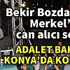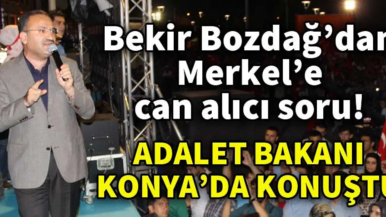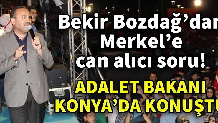Adalet Bakanı Bekir Bozdağ Konya Mevlana Meydanı’nda 15 Temmuz’dan bu yana devam eden halkın kutlu direnişine katıldı. Burada açıklamalarda bulunan Bozdağ, Almanya Başbakanı Merkel ve AB üyesi ülkelere, “Sizin lügatınızda demokrasinin anlamı teröristlere hürriyet, milletin hukukunu ve demokrasiyi savunan meşru Cumhurbaşkanına yasak anlamına mı geliyor?” dedi.