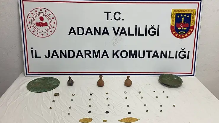 Adana'da İl Jandarma Komutanlığı ekiplerince bir araçta yapılan aramada tarihi eser niteliğinde çeşitli objeler bulundu.