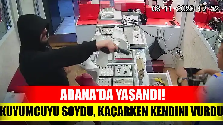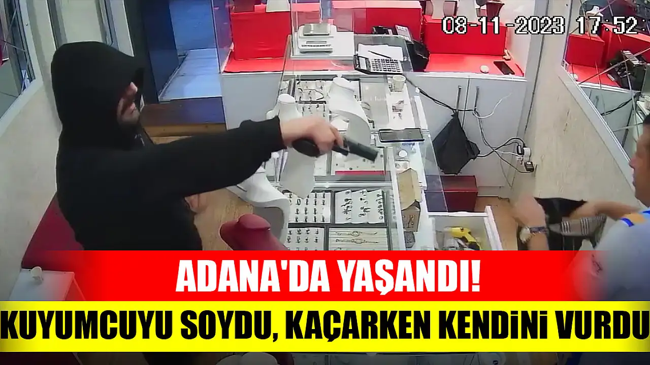 Adana'da bir kişi tabancayla girdiği kuyumcuyu etkisiz hale getirip, bir poşet altını alıp kaçtı. Bu anlar saniye saniye güvenlik kamerası tarafından görüntülenirken, şüphelinin kaçarken kendini vurduğu ortaya çıktı. Soygunu yapan ve ona yardım ettiği öne sürülen şahıs yakalanıp tutuklandı.