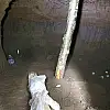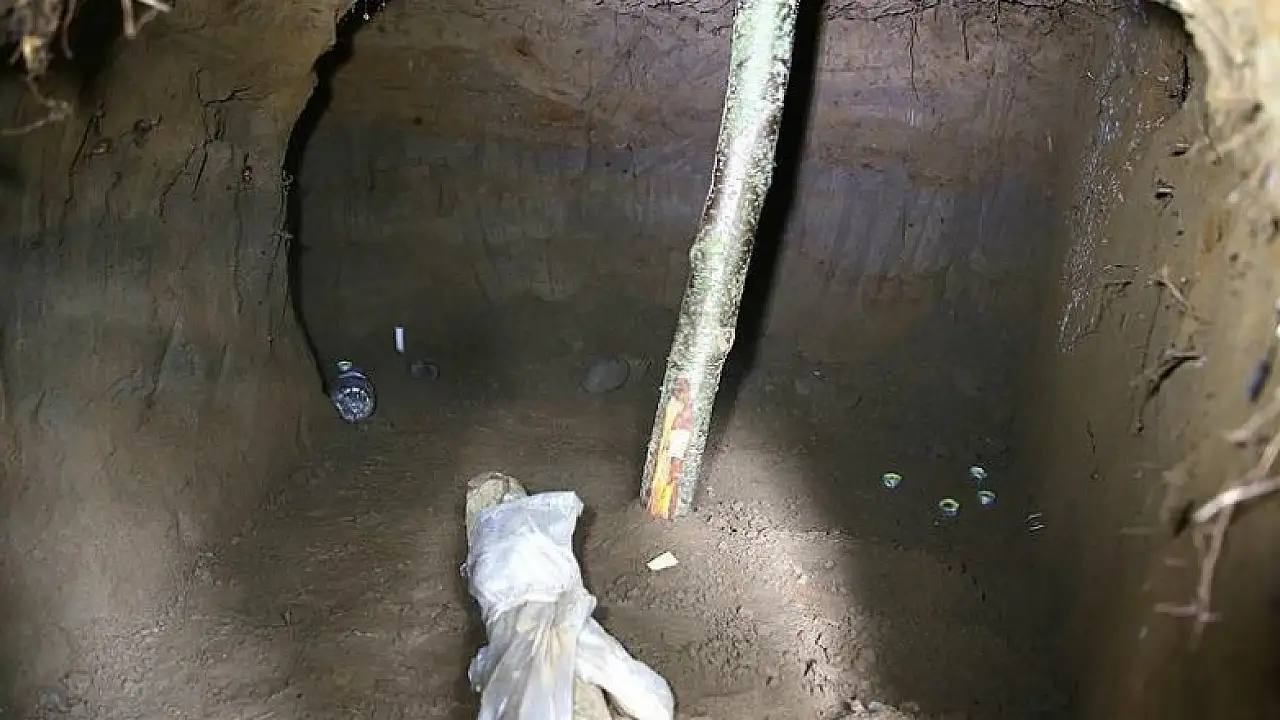 Çökmemesi için tavan kısmı ağaçlarla desteklenen yerde, dün de poşet, kazma, kürek, su şişesi, eşofman gibi malzemelere rastlanmıştı.