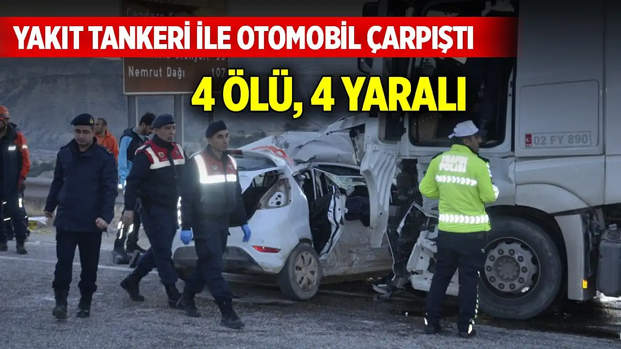 Adıyaman'ın Besni ilçesinde, akaryakıt tankeri ile otomobilin çarpıştığı kazada 4 kişi yaşamını yitirdi, 4 kişi yaralandı.
