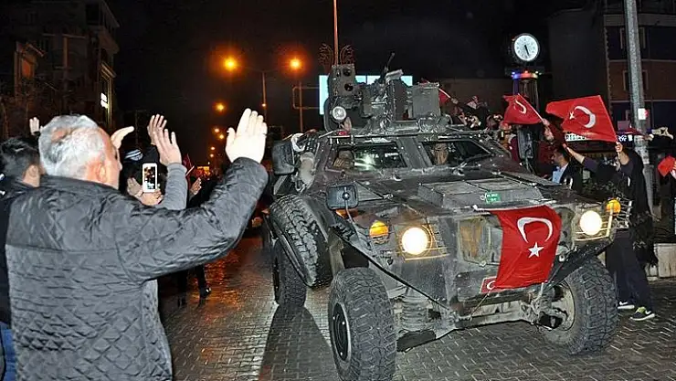 Ellerinde Türk bayraklarıyla güzergah üzerinde bekleyen vatandaşlar, "Şehitler ölmez vatan bölünmez", "Ya Allah bismillah Allah'u ekber" sloganları atarak, askere destek verdi.