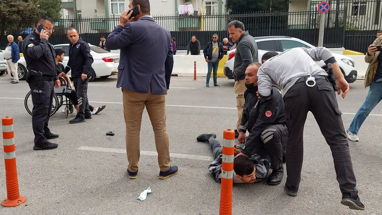 TEKERLEKLİ SANDALYE İLE GELİP, ADLİYE ÖNÜNDE ATEŞ ETTİ