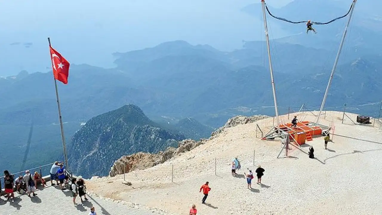 Kemer'de 2365 rakımlı Tahtalı Dağı'na teleferikle çıkan tatilcilerin adrenalini, 'insan sapanı' ile adeta zirve yapıyor.