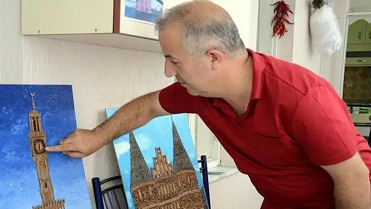 Özellikle çam ve çınar ağaçlarının kabuklarını kullanan Özdemir, tarihi binaların yanı sıra uzun süren uğraşlar sonucu ortaya çıkarttığı Kabe, İstanbul Ortaköy Cami ve Galata Kulesi'ni resmettiği 11 tabloyu evinin bir köşesinde sergiliyor.