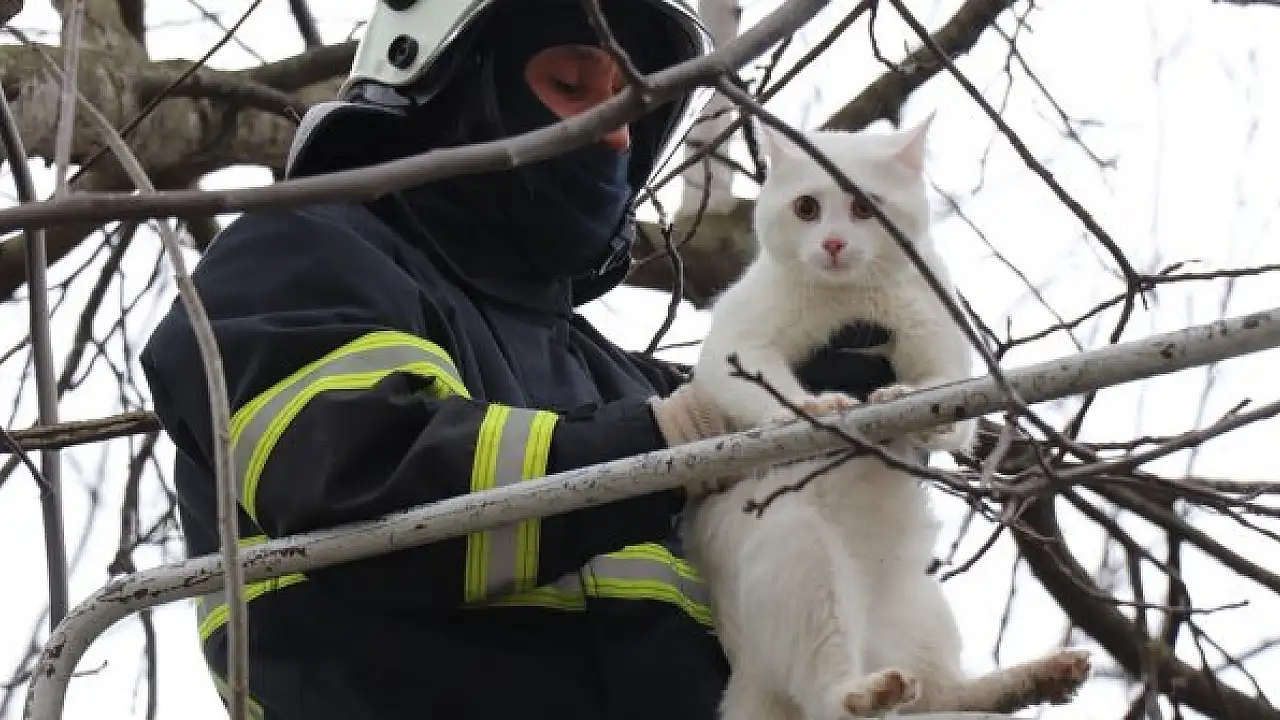 Ağaçta mahsur kalan kediyi itfaiye kurtardı