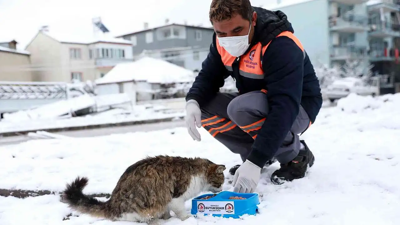 Denizli Büyükşehir Belediyesi ekipleri, il genelinde karla mücadele çalışmalarını sürdürürken, ağır kış koşullarında sokak hayvanlarını da unutmuyor.