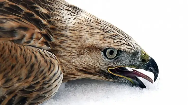 Konya'da zorlu kış şartlarında yaban hayatını görüntüleyen fotoğraf tutkunları, yol kenarında yiyecek ararken yaralanan bir kızıl şahine yardım etmeye çalıştı.