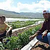 Ağrı Dağı eteğindeki 12 dönümlük arazisinde domates üreten Osman Aytekin, 30 dereceyi bulan sıcaklıkta 11 yaşındaki oğlu Serhat Aytekin ile çalışıyor.