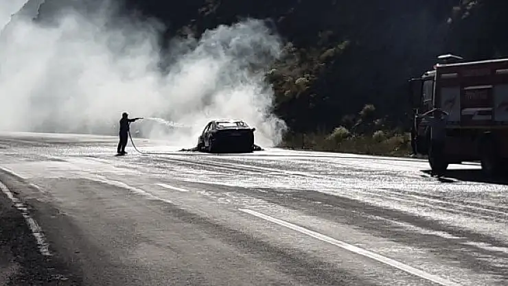 AĞRI'nın Eleşkirt ilçesinde seyir halindeyken alev alan otomobil kullanılamaz hale geldi. Alev topuna dönen otomobil nedeniyle Erzurum-Ağrı yolu trafiğe kapanırken uzun araç kuyrukları oluştu.