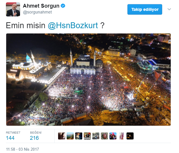 Hüsnü Bozkurt’un, "Evet çıkarsa yedi sülalenizi denize dökeriz" gibi tehditler içeren konuşması için Ankara Cumhuriyet Başsavcılığınca "halkı kin ve düşmanlığa tahrik" suçundan soruşturma açtı. Ak Parti Genel Başkan Yardımcısı ve Konya Milletvekili Ahmet Sorgun’un Hüsnü Bozkurt'a tepkisi ise tam bir ‘kapak’ niteliğindeydi. Ahmet Sorgun attığı Twitte Mevlana Meydanı'ndaki demokrasi nöbetinden çekilen bir fotoğrafla tek kelimelik bir soru sordu: "Emin misin?" Bu dikkat çekici ve çarpıcı tepki çok kısa süre içinde yüzlerce retweet ve beğeni aldı.
