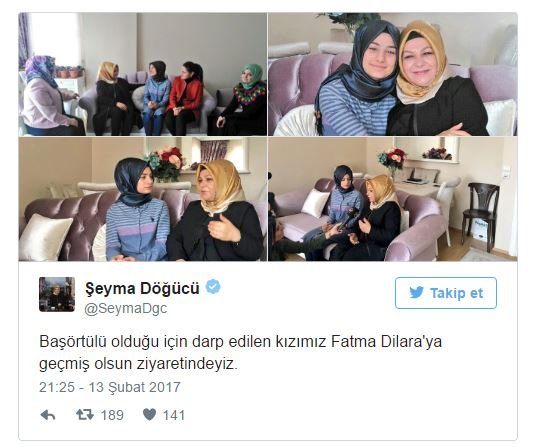 AK Parti İstanbul İl Kadın Kolları Başkanı Şeyma Döğücü, saldırıya uğrayan 16 yaşındaki Fatma Dilara Aslıhan'ı evinde ziyaret etti. Döğücü, "İnanca ve kadına şiddetin karşısında topyekün bir duruş sergilemeliyiz" dedi.