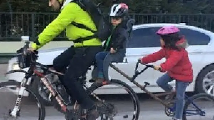 Bursa'da bisiklet tutkunu baba, yaptığı özel aparatla iki çocuğunu da bisikletine bindirip tur atıyor. Hafta sonu baba ve çocuklarına anneleri de başka bir bisiklet ile eşlik ediyor.