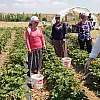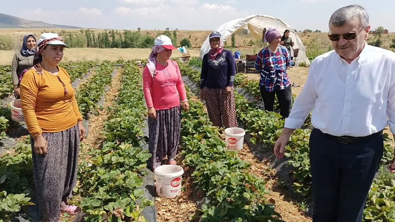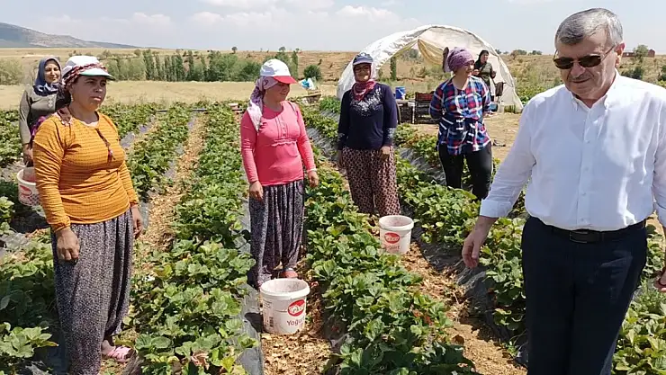 Suludere Mahallesi'nde çilek bahçelerini de gezen Akyürek, çilek hasadı yapan ailelerle çilek topladı.