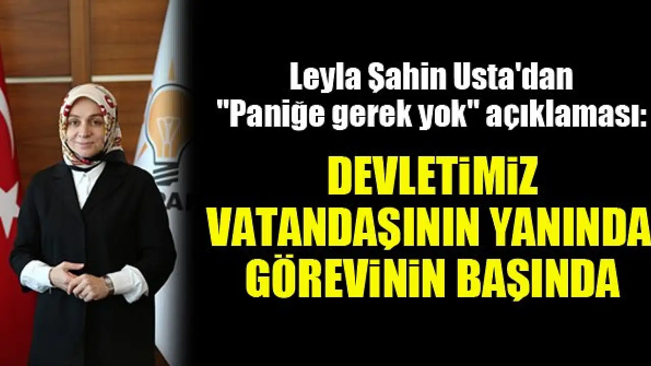 AK Parti Genel Başkan Yardımcısı Leyla Şahin Usta, yeni tip koronavirüs (Kovid-19) tedbirlerinin doğru olduğunu ve kimsenin paniğe kapılmaması gerektiğini belirterek, devletin vatandaşın her ihtiyacını karşılamak için görev başında olduğunu bildirdi.