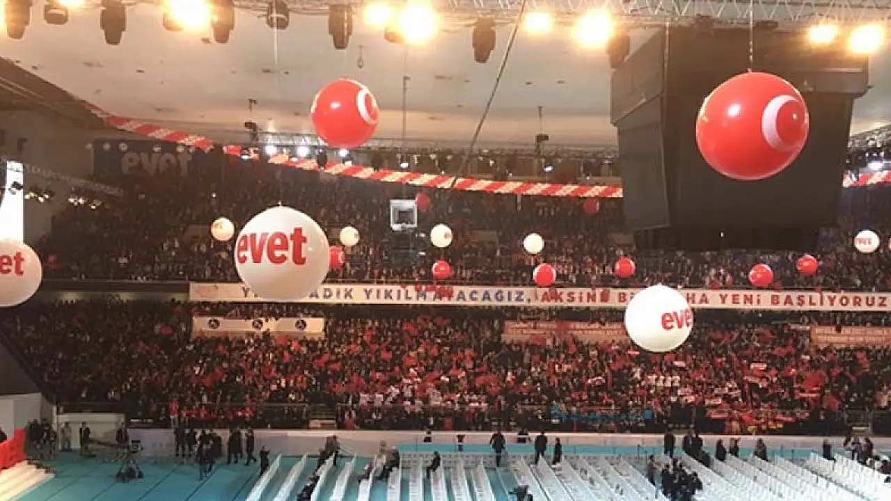 Sabahın ilk saatlerinden itibaren AK Partililerin doldurmaya başladığı Ankara Arena'da referandum atmosferine girildi. Salonda bulunanlar #daimamilletkararımızevet etiketiyle paylaşımlarda bulunuyor. AK Parti Gençlik Kolları Başkanı Melih Ecertaş da tribünleri dolduran vatandaşların coşkusunu paylaştı.