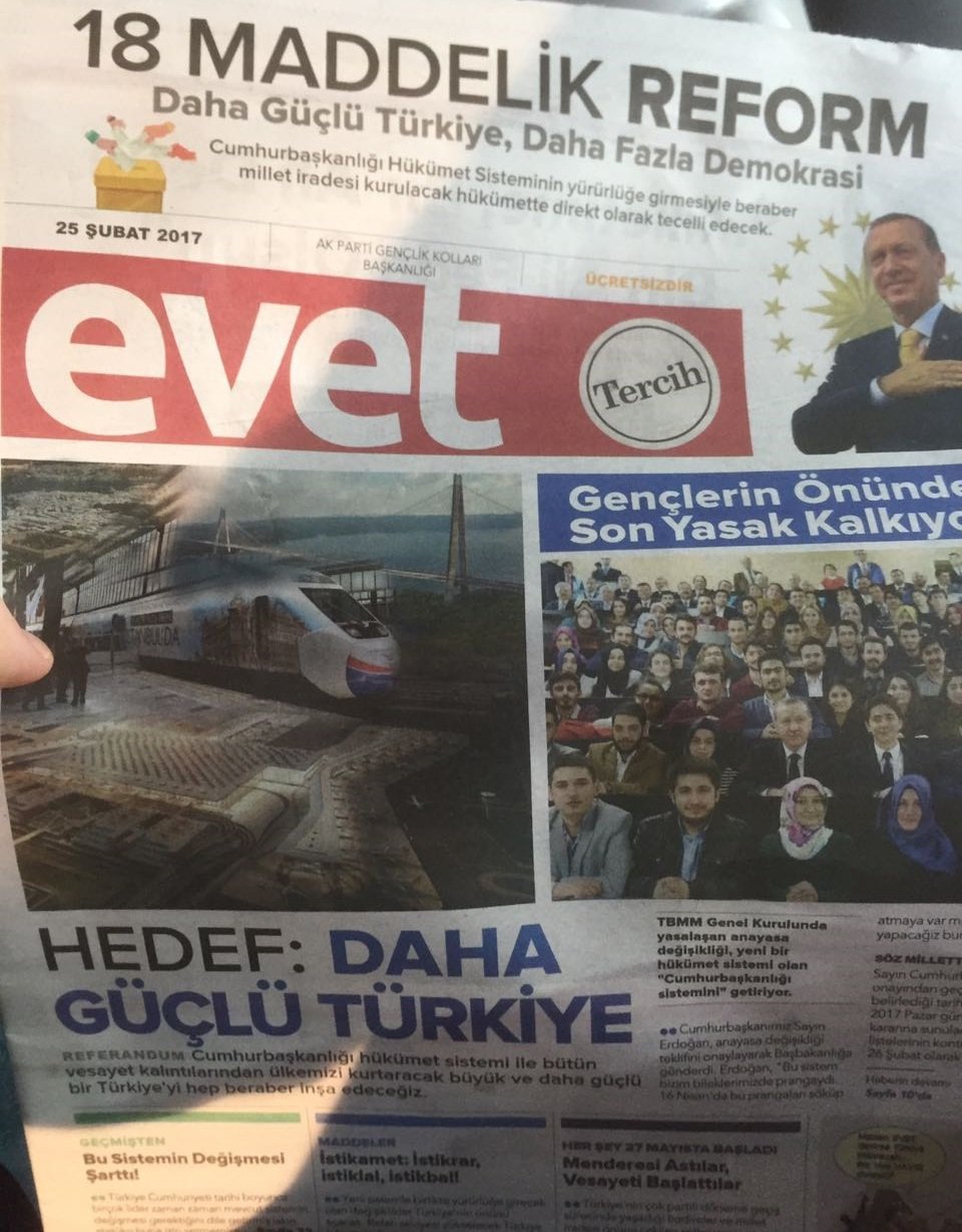 Salona gelen binlerce vatandaşa AK Parti Gençlik Kolları Başkanlığı tarafından hazırlanan 'Evet' gazetesi dağıtıldı. Ücretsiz olarak sunulan gazetede, referanduma dair detaylar anlatılıyor. Halk oylamasına sunulacak 18 madde ve hedefler ayrıntılı olarak belirtildi.