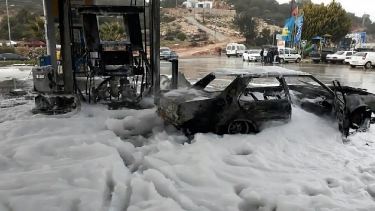 Kaş Belediyesi itfaiye ekiplerince söndürülen yangında, akaryakıt istasyonundaki bir pompa ile otomobil kullanılamaz hale geldi.