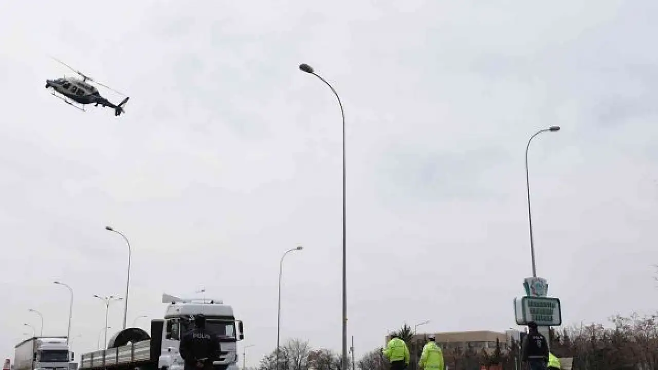 Aksaray İl Emniyet Müdürlüğü, helikopter destekli trafik uygulaması ile karayollarında denetim yaparak kilometrelerce uzaktaki sürücülerin ihlallerini tespit etti