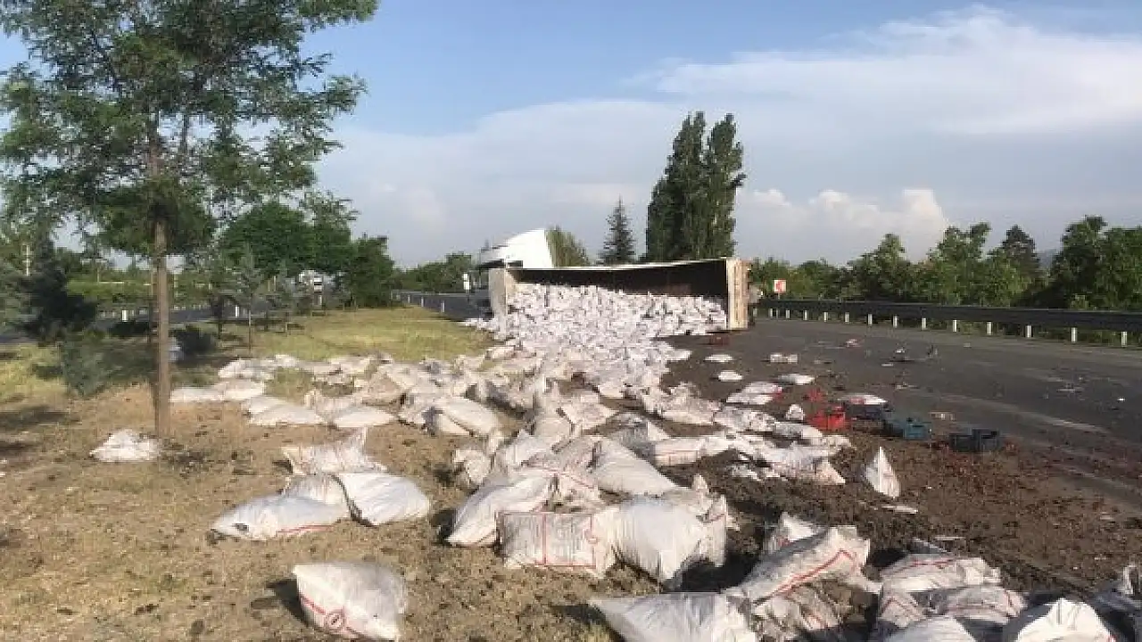 Kamyonetteki kiraz ve çileklerin yola saçıldığı, tırın dorsesinin devrildiği kazada yaralanan Ali Burhan, ambulansla Akşehir Devlet Hastanesi'ne kaldırıldı.