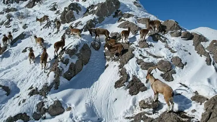 Kayseri'nin Yahyalı İlçesi sınırları içerisinde yer alan Aladağlar Milli Parkı'nda yaşamlarını sürdüren dağ keçileri yiyecek bulmak için Aladağlar eteklerine indi.