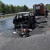 Anadolu Otoyolu Sakarya geçişinde seyir halindeyken alev alev yanan yabancı plakalı otomobilden geriye, demir yığınları kaldı.