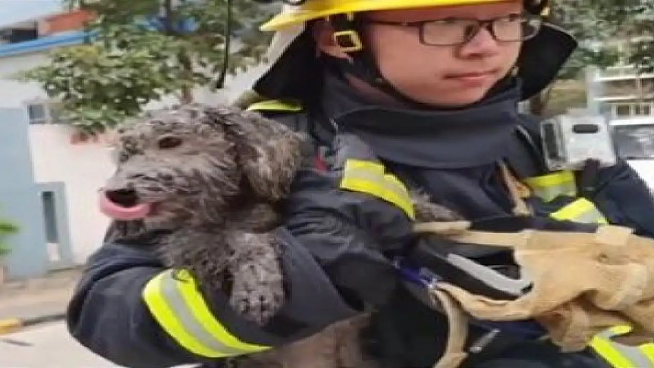 Çin'in Guangxi Zhuang Özerk Bölgesi'nde bir binada alevlerin arasında kalarak balkona sığınan köpeği itfaiye ekibi kurtardı.