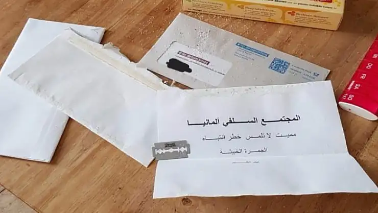 Yeşiller Partisi Milletvekili Christian Ströbele, twitter hesabından yaptığı paylaşımda kendisine gönderilen mektubun içinden beyaz toz, tıraş zileti ve Arapça yazılmış bir kağıt çıktığını açıkladı.