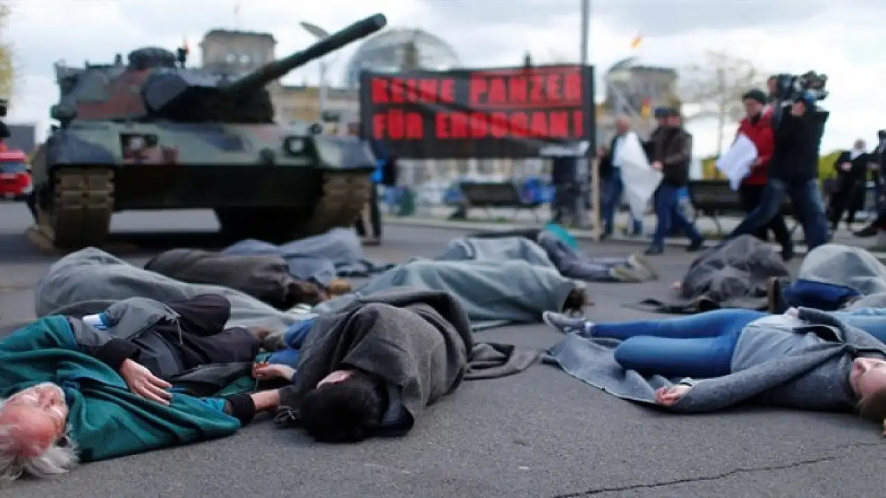 Almanya'nın başkenti Berlin'de bir grup protestocu, Almanya'nın Türkiye'ye tank satışını protesto etti. Almanlar, tankların önüne yatarak, "Erdoğan'a tank yok" şeklinde komik sloganların yazılı olduğu pankartları taşıdılar.