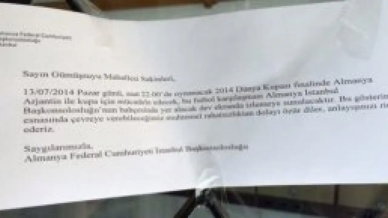 Gümüşsuyu'nda bulunan Almanya Federal Başkonsolosluğu, 7-1’lik Brezilyagalibiyetinin ardından bu Pazar oynanacakArjantin maçı öncesinde mahalledeki apartmanlarda yazılı bir duyuru yaparak, final karşılaşmasının bahçeye kurulacak dev ekrandan izleneceğini belirtti ve “Verebileceğimiz muhtemel rahatsızlıktan dolayı özür diler, anlayışınızı rica ederiz” dedi.