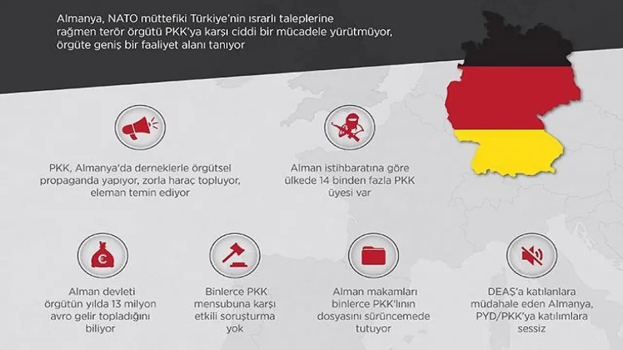 Almanya, NATO müttefiki Türkiye’nin ısrarlı taleplerine rağmen terör örgütü PKK’ya karşı ciddi bir mücadele yürütmüyor, örgüte geniş bir faaliyet alanı tanıyor.