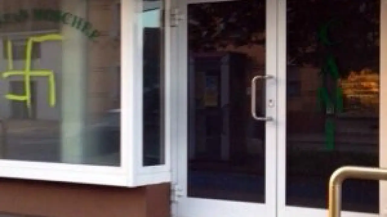 Almanya'da Baden-Württemberg eyaletinde bulunan bir caminin duvarlarına, camlarıma ve cami önündeki yaya yoluna gamalı haç çizilerek ve 'Dışarı' yazıldı.