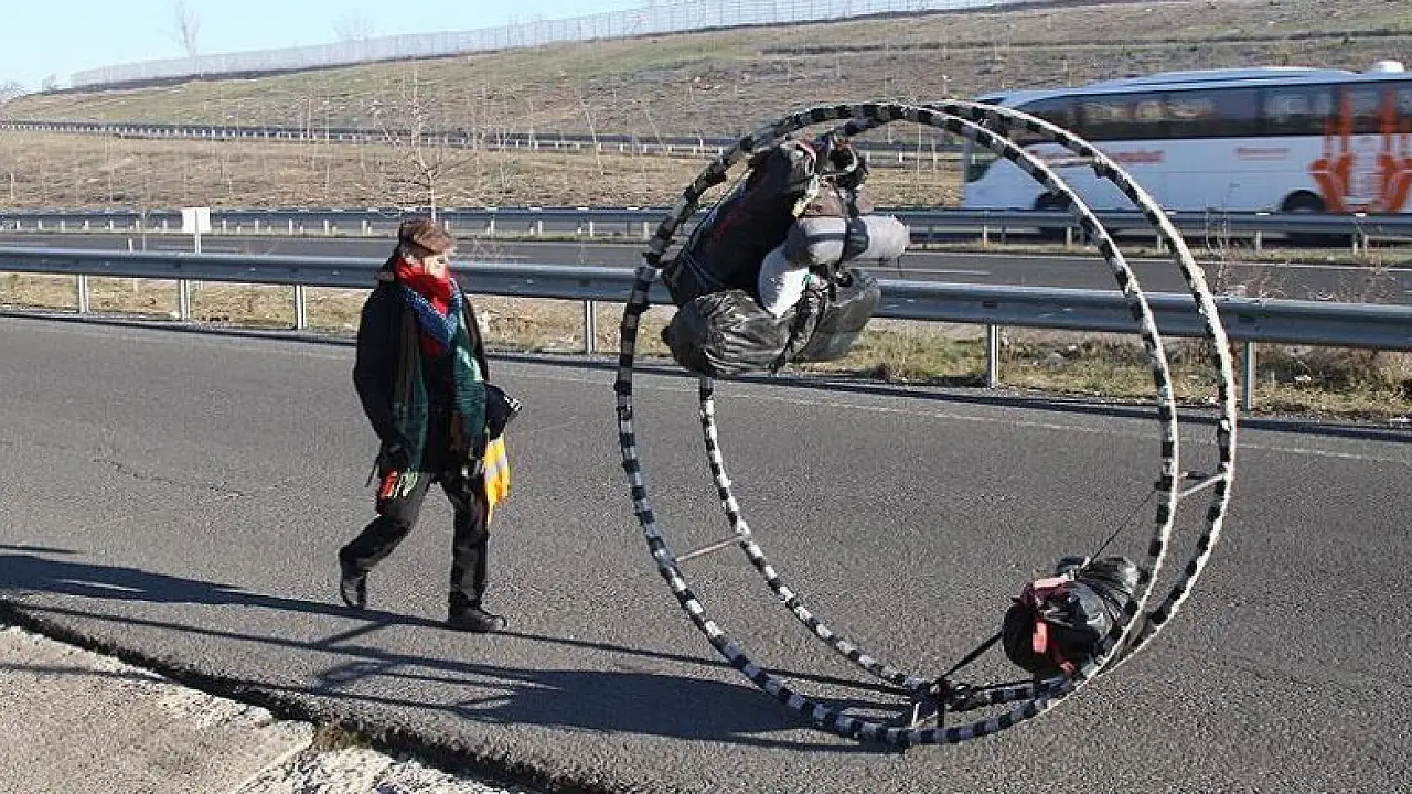 Almanya'dan barış mesajı vermek üzere geçen yıl dev çemberle yola çıkanİranlı cimnastikçi Shahin Tivay Sadatolhosseini, eşyalarını ve valizlerini içerisine koyduğu çemberi çevirip barış mesajları vererek seyahat ediyor.