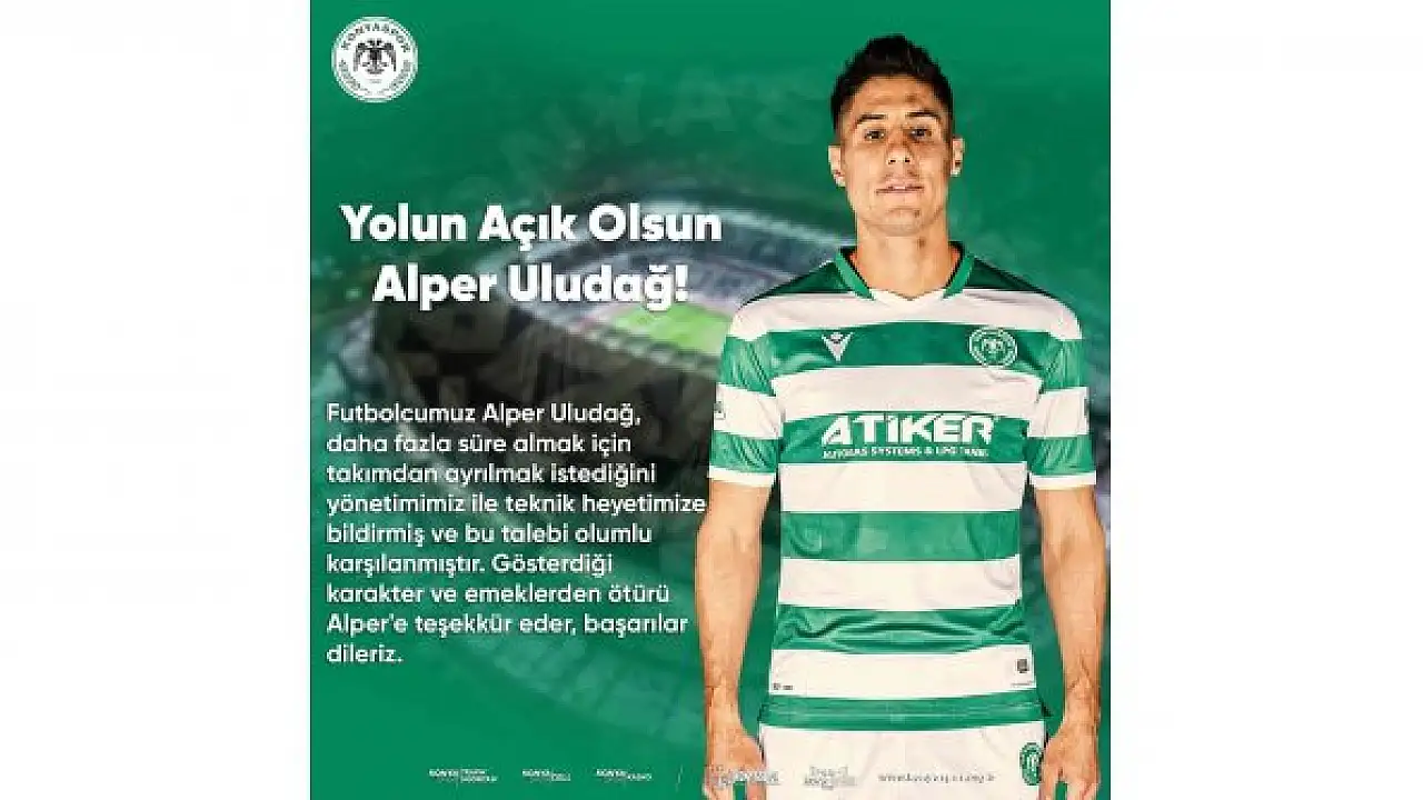 Konyaspor, 31 yaşındaki futbolcu Alper Uludağ ile yolların ayırıldığını duyurdu. Yeşil-beyazlı kulübün sosyal medya hesabından yapılan açıklamada, "Futbolcumuz Alper Uludağ, daha fazla süre almak için takımdan ayrılmak istediğini yönetimimiz ve teknik heyetimize bildirmiş ve bu talebi olumlu karşılanmıştır. Gösterdiği karakter ve emeklerden ötürü Alper'e teşekkür eder, başarılar dileriz" ifadeleri kullanıldı.