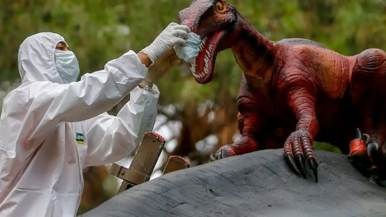 Dinozor maketlerinin, ziyaretçileri maske ile karşılaması ise ilginç görüntü oluşturuyor.