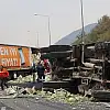 Çarpmanın etkisiyle kamyon ve tır yan yattı.