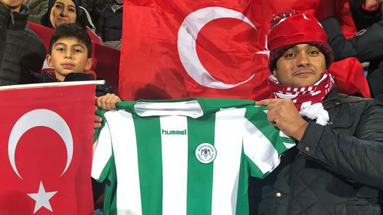 Millilerimizi destekleyen taraftarlarımızın bulunduğu misafir tribünde yer alan bir Konyaspor taraftarı, Konyaspor formasıyla poz verdi.