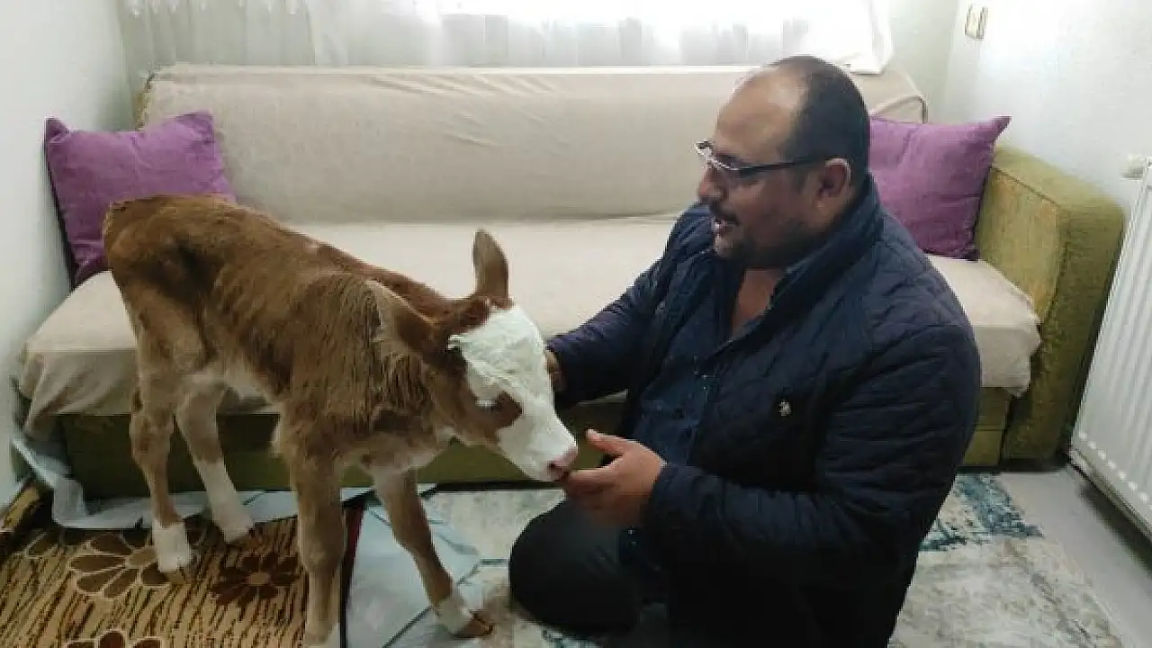 Konya'da hayvancılıkla uğraşan Ahmet Uyar, doğum sırasında annesi öldüğü için "Öksüz" adını verdiği buzağıya evinde bakmaya başladı.